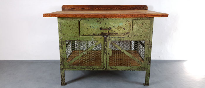 Frontale Ansicht einer Werkbank mit Lochblech-Korpus. Tischplatte ist aus Holz.